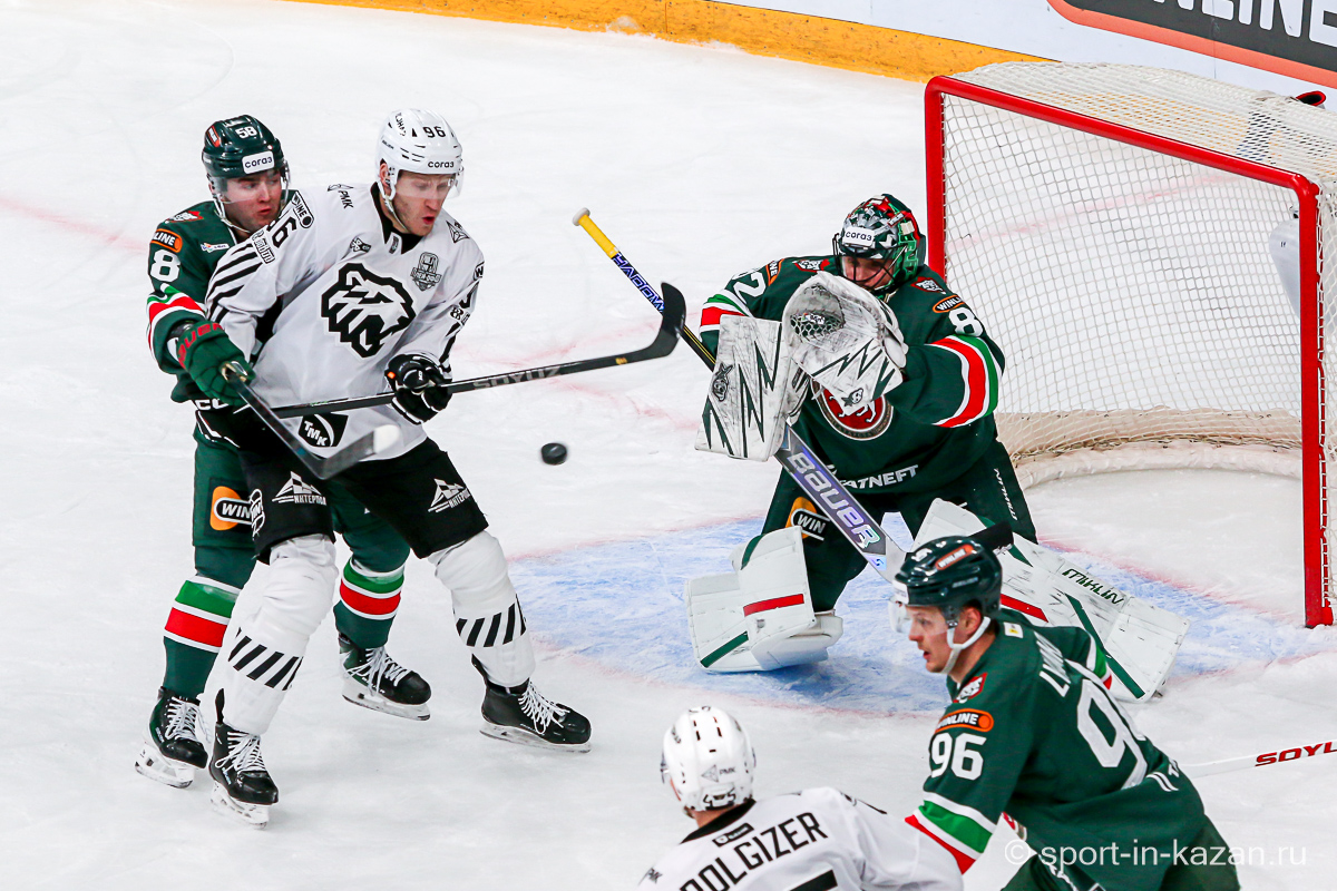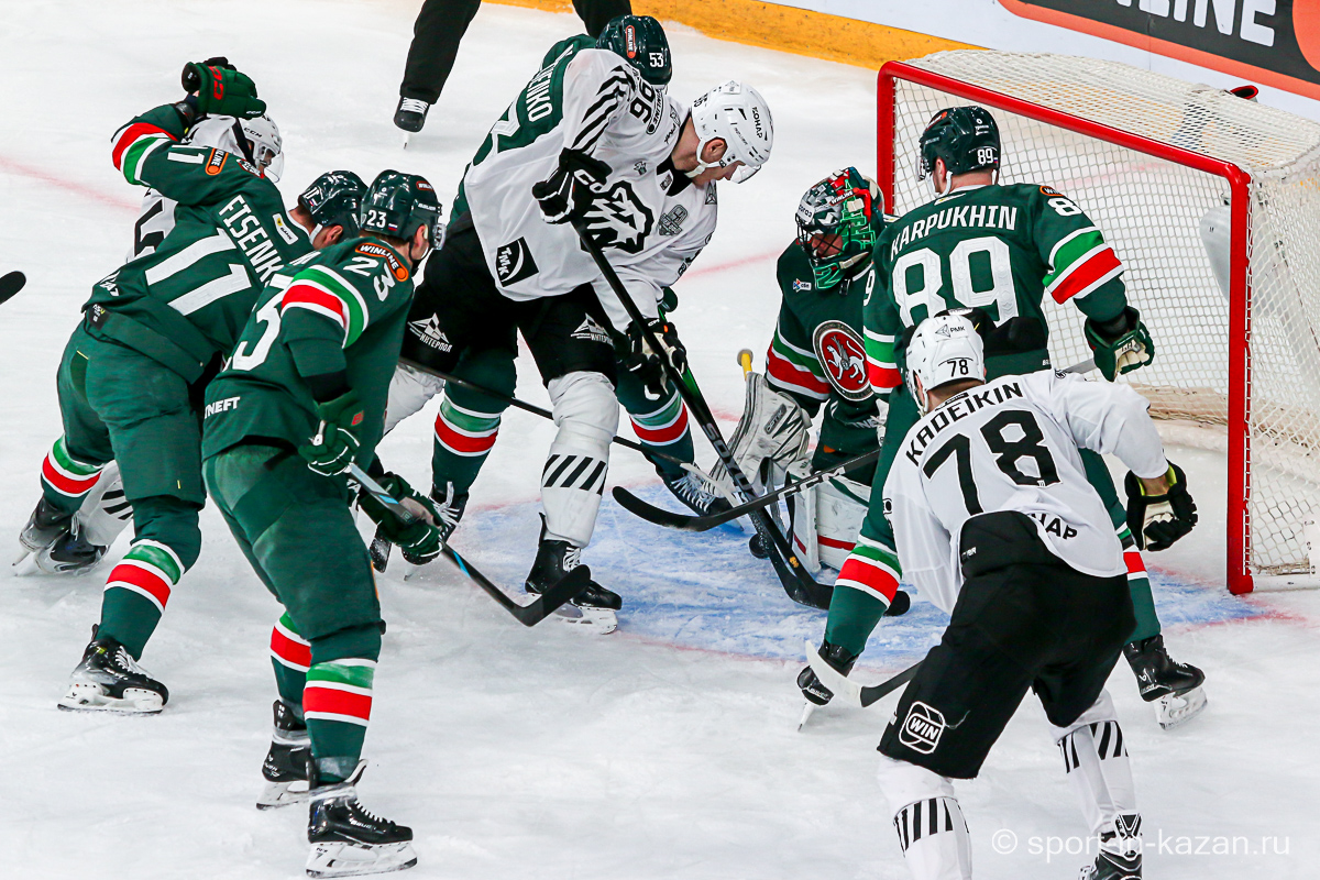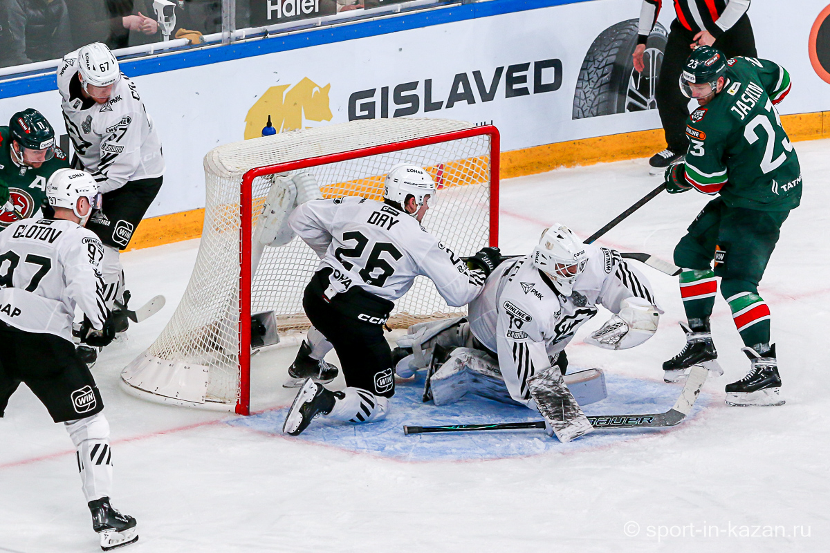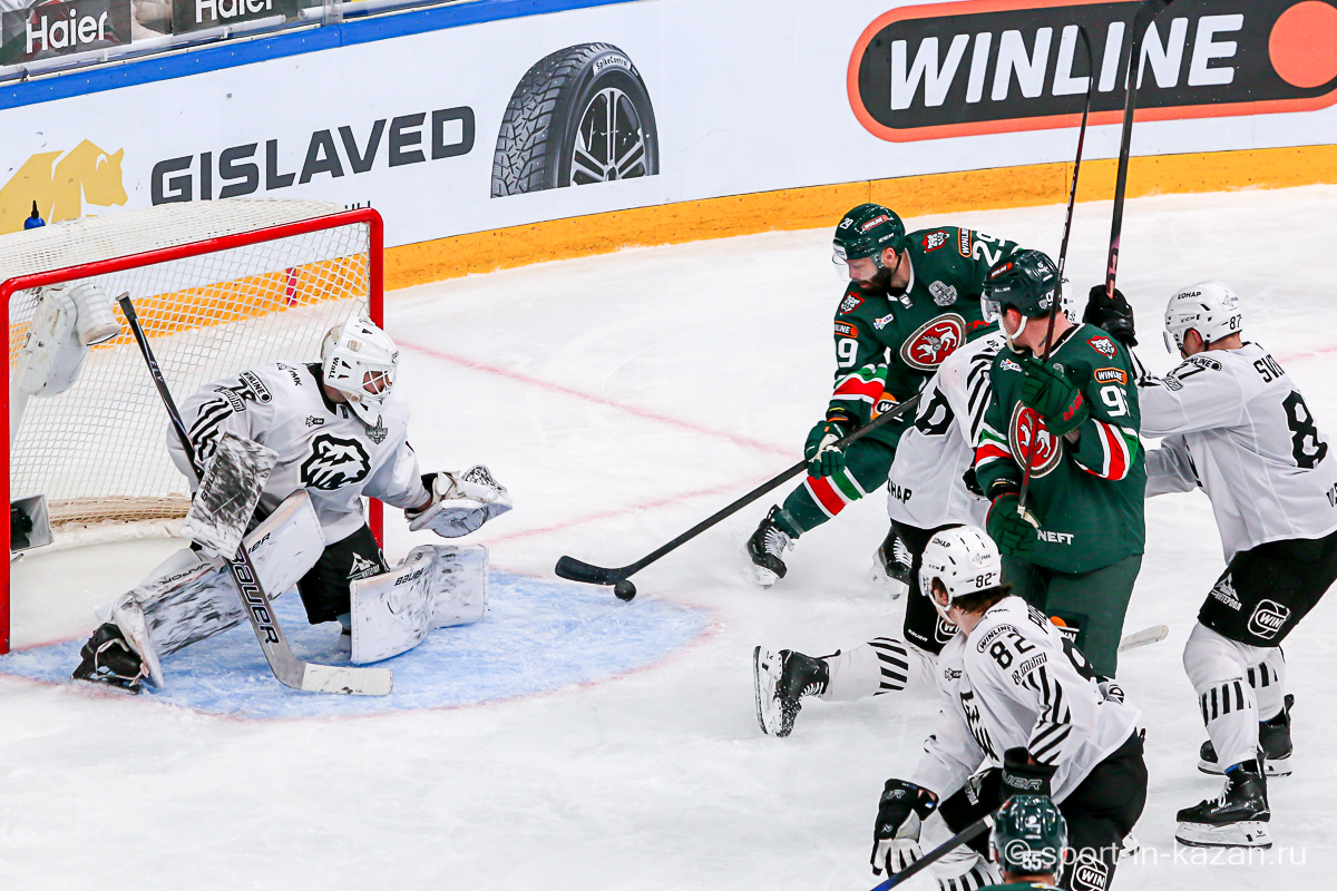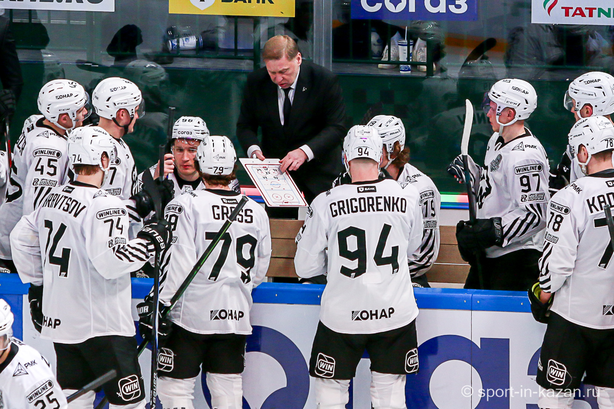 Четвертый период активнее начали хозяева, но затем уральцы отжали себе шайбу и стали буквально возить по зоне подсевших «барсов», периодически обстреливая ворота Билялова. На 68-й минуте уже казанцы ответили своей затяжной осадой владений Николаева, но тоже успеха не добились. Когда период перевалил экватор с трибун понеслось дружное скандирование «Шайбу! Шайбу!» и, надо признать, на четвертом часу игры трибуны эти изрядно опустели. На 72-й минуте увлекшиеся нападением хозяева прозевали чистый выход га ворота Джиошвили, но великолепный Билялов оставил партнеров в игре. Далее Билялов совершил еще один чудо-сэйв от Кравцова. Дважды обязан был забивать Кателевский, а в итоге этот нервяк прервал броском с острейшего угла от самого борта Илья Сафонов. По пути шайба задела Барабанова, на счет которого гол и был записан… Победную третью шайбу казанцы забросили, когда играть в четвертом периоде оставалось три минуты и тридцать три секунды… И вот не верь после этого в магию цифр!
