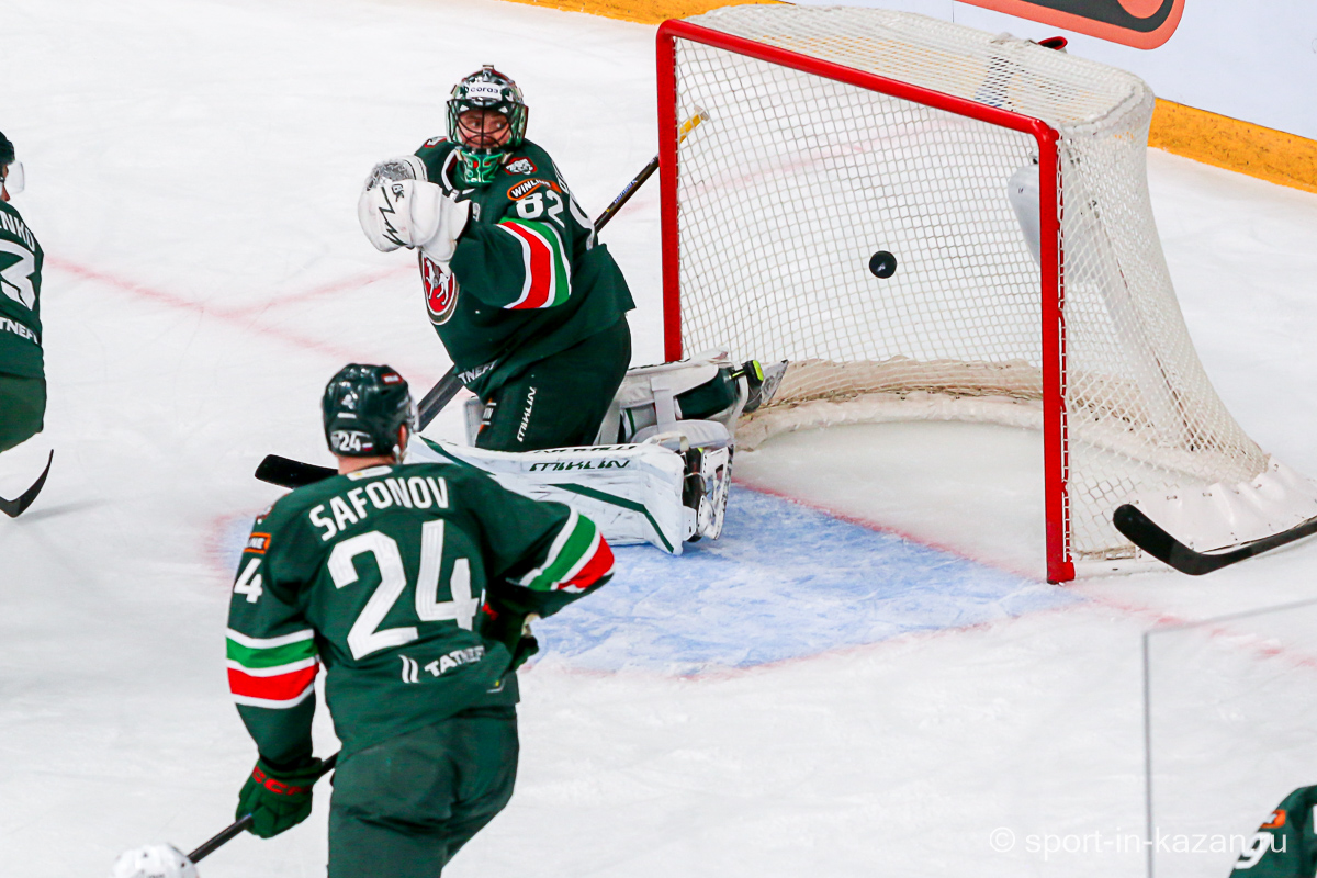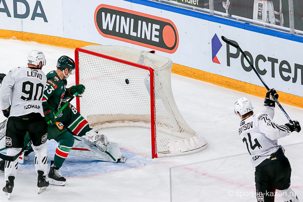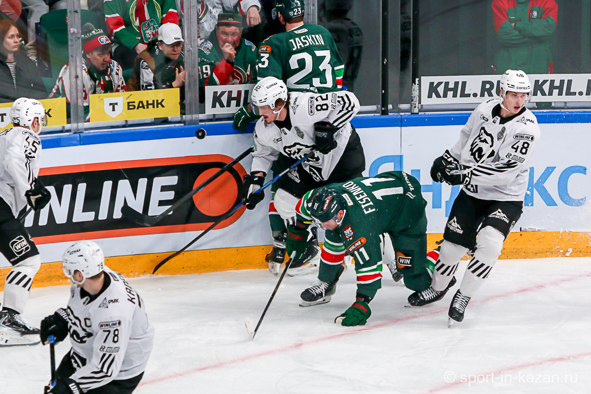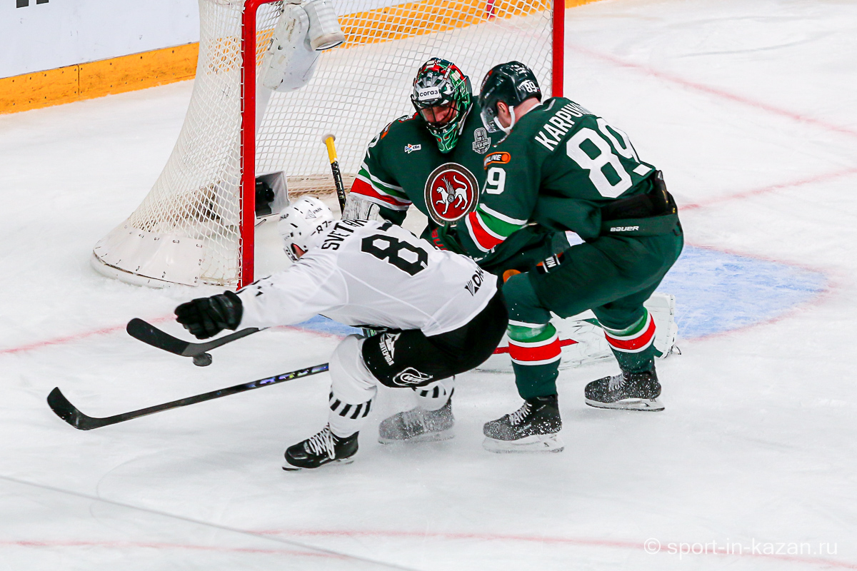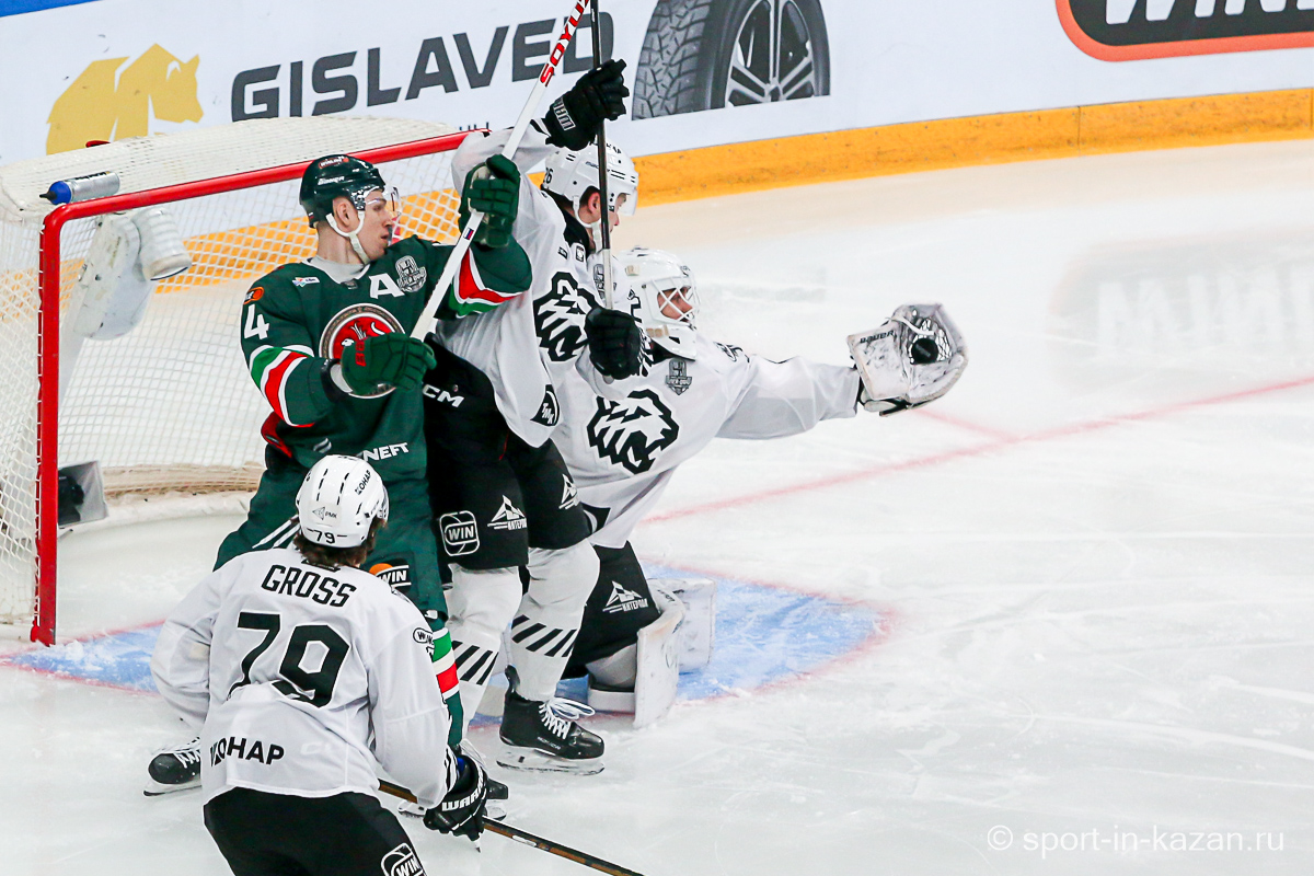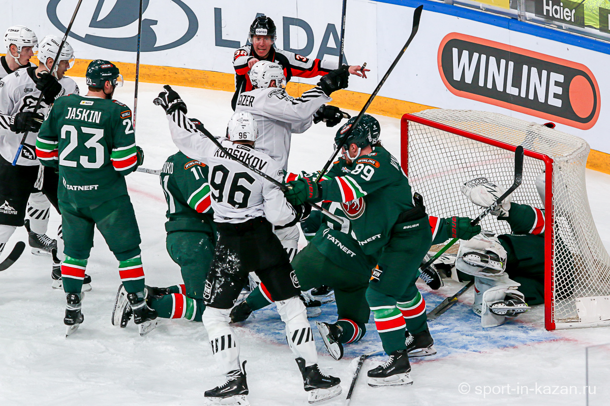 Четвертый период активнее начали хозяева, но затем уральцы отжали себе шайбу и стали буквально возить по зоне подсевших «барсов», периодически обстреливая ворота Билялова. На 68-й минуте уже казанцы ответили своей затяжной осадой владений Николаева, но тоже успеха не добились. Когда период перевалил экватор с трибун понеслось дружное скандирование «Шайбу! Шайбу!» и, надо признать, на четвертом часу игры трибуны эти изрядно опустели. На 72-й минуте увлекшиеся нападением хозяева прозевали чистый выход га ворота Джиошвили, но великолепный Билялов оставил партнеров в игре. Далее Билялов совершил еще один чудо-сэйв от Кравцова. Дважды обязан был забивать Кателевский, а в итоге этот нервяк прервал броском с острейшего угла от самого борта Илья Сафонов. По пути шайба задела Барабанова, на счет которого гол и был записан… Победную третью шайбу казанцы забросили, когда играть в четвертом периоде оставалось три минуты и тридцать три секунды… И вот не верь после этого в магию цифр!