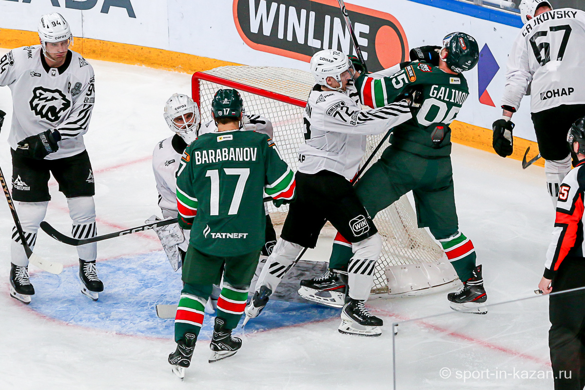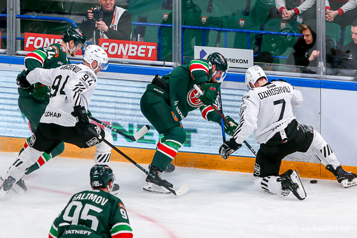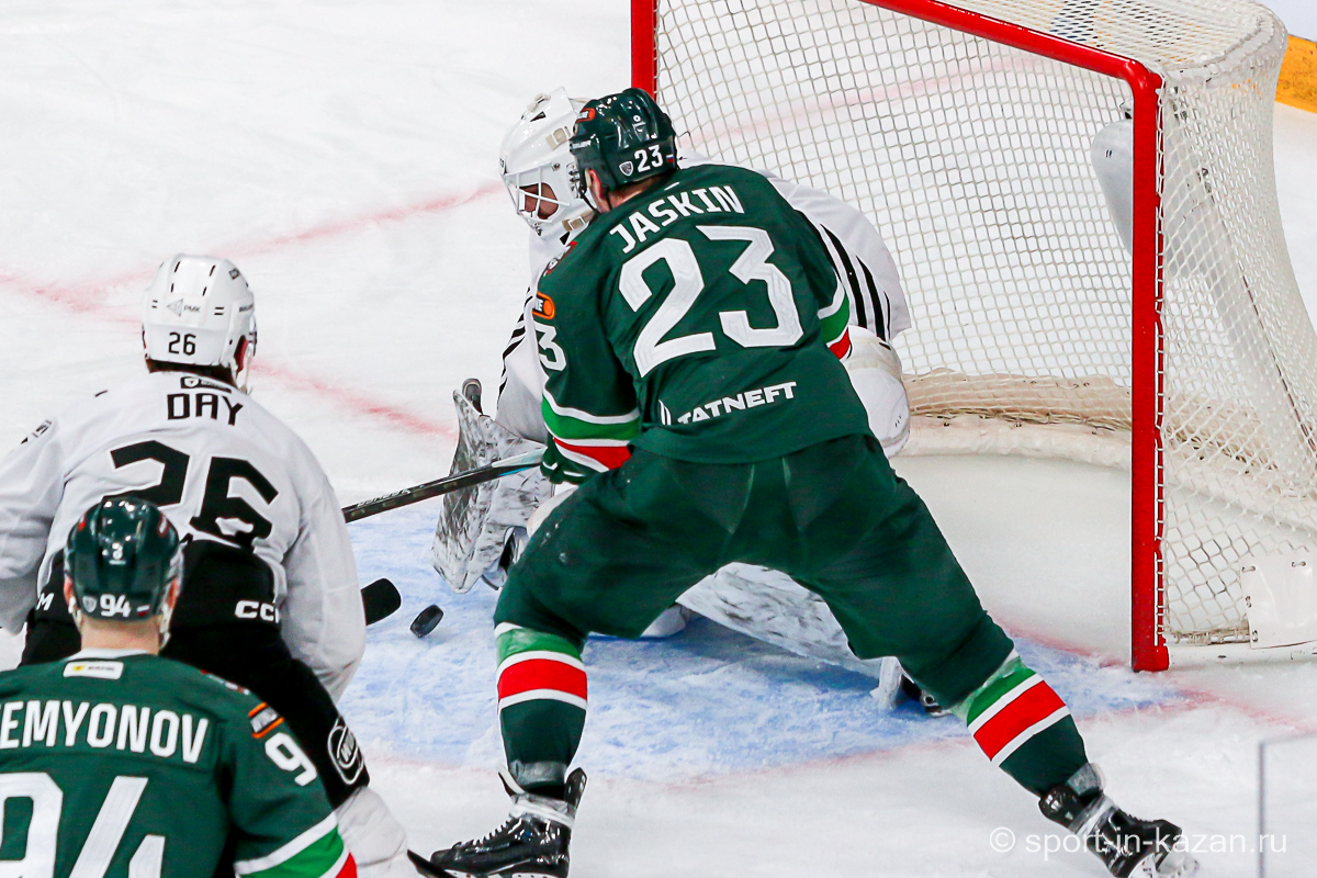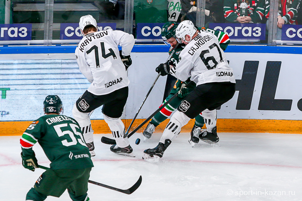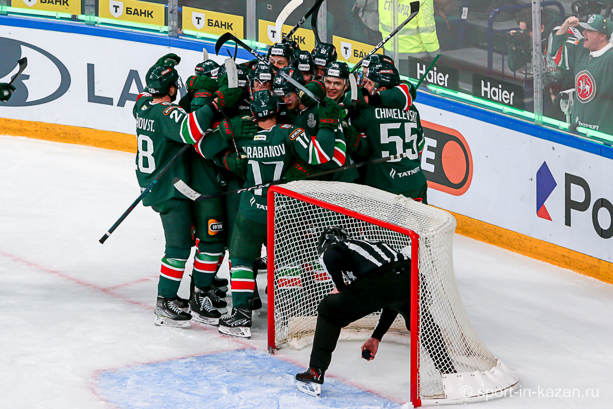 Четвертый период активнее начали хозяева, но затем уральцы отжали себе шайбу и стали буквально возить по зоне подсевших «барсов», периодически обстреливая ворота Билялова. На 68-й минуте уже казанцы ответили своей затяжной осадой владений Николаева, но тоже успеха не добились. Когда период перевалил экватор с трибун понеслось дружное скандирование «Шайбу! Шайбу!» и, надо признать, на четвертом часу игры трибуны эти изрядно опустели. На 72-й минуте увлекшиеся нападением хозяева прозевали чистый выход га ворота Джиошвили, но великолепный Билялов оставил партнеров в игре. Далее Билялов совершил еще один чудо-сэйв от Кравцова. Дважды обязан был забивать Кателевский, а в итоге этот нервяк прервал броском с острейшего угла от самого борта Илья Сафонов. По пути шайба задела Барабанова, на счет которого гол и был записан… Победную третью шайбу казанцы забросили, когда играть в четвертом периоде оставалось три минуты и тридцать три секунды… И вот не верь после этого в магию цифр!