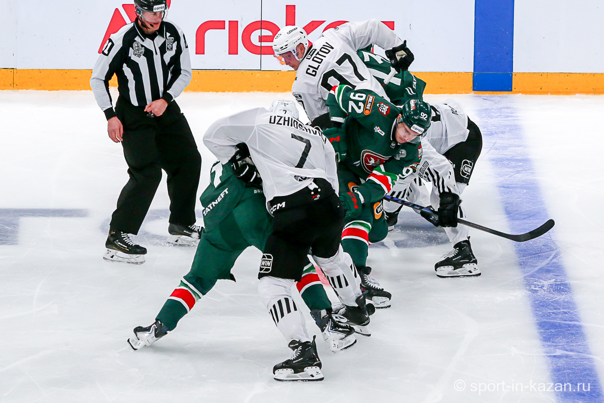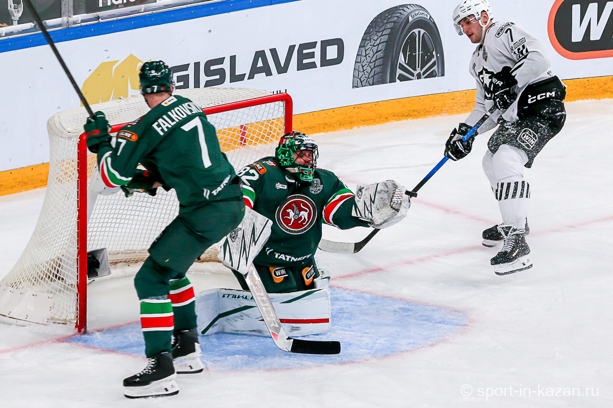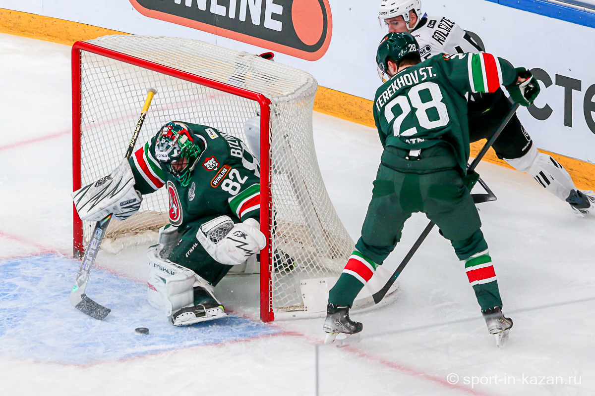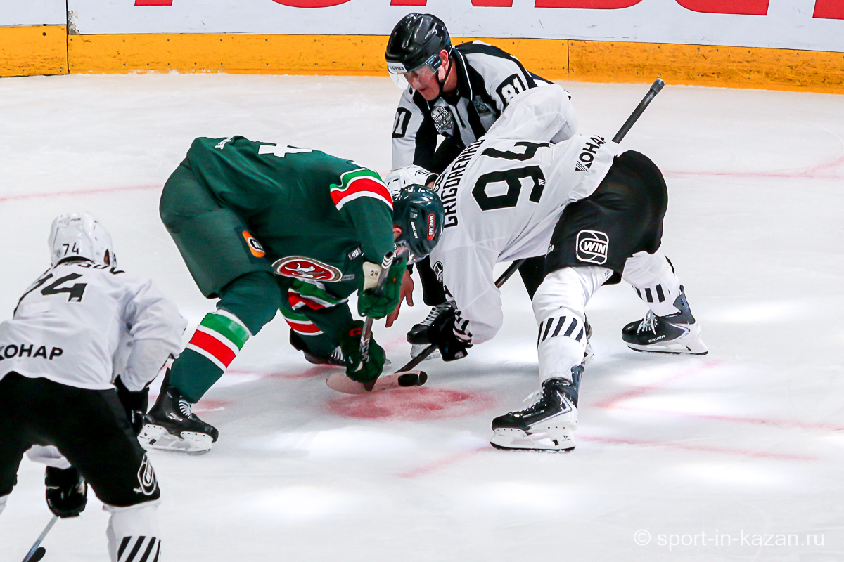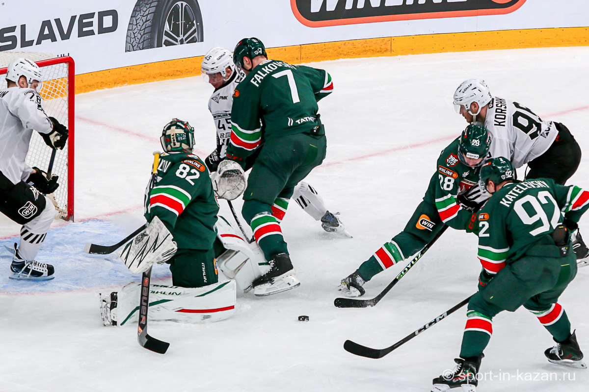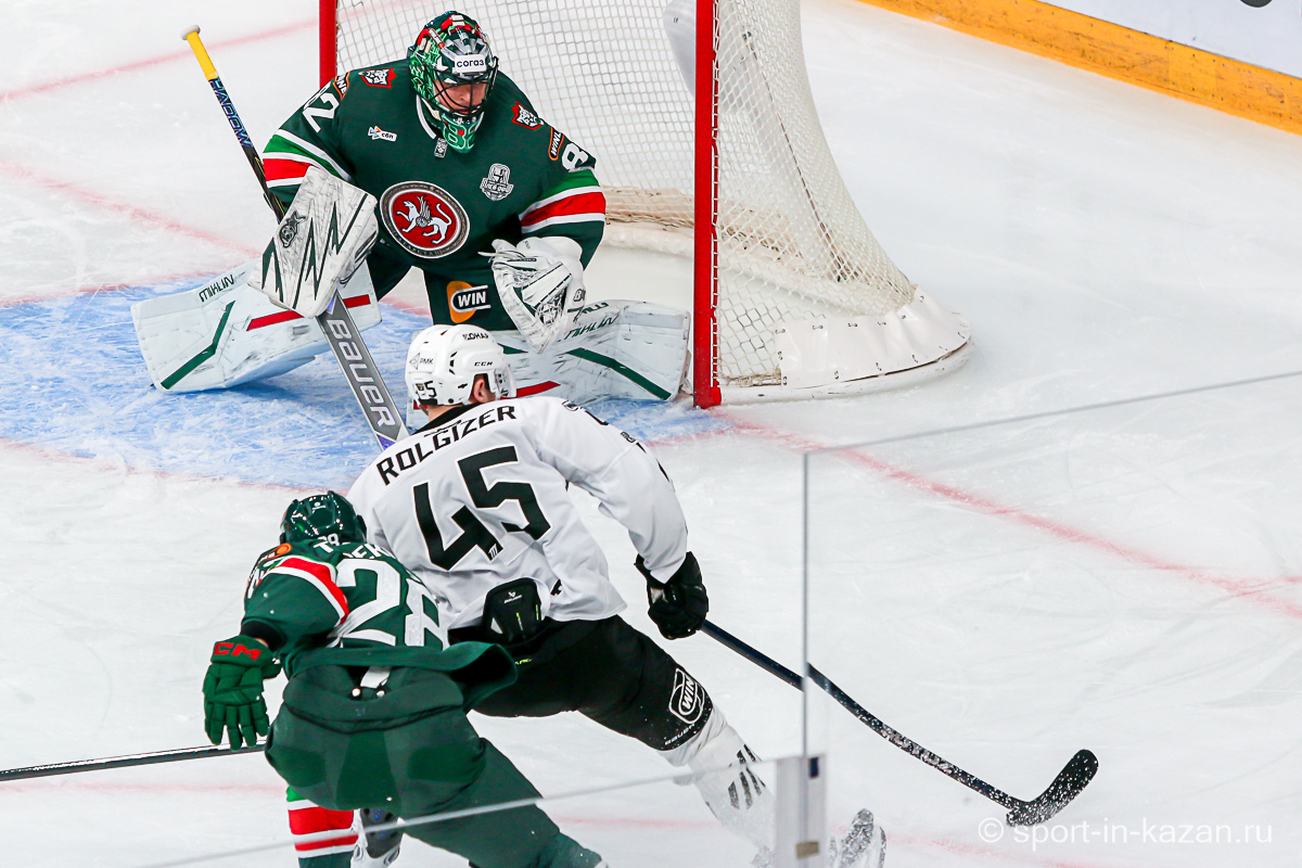 Данис Зарипов стал главным героем величественного предматчевого шоу. Капитан Татарстан снимал на льду маску Мистера Икс и взмывал вверх за золотой клюшкой, которой он усмирял спустившегося с уральского хребта Белого Медведя. На льду все оказалось гораздо сложнее, хотя Семенов с первых секунд и задал игре атакующий вектор. Но на второй минуте Денисенко зацепил Кадейкина и хозяева вынуждены были обороняться. Билялов отразил бросок Григоренко, а потом Сененов в одиночку убежал к воротам Николаева, но его остановили без нарушения правил. На 7-й минуте с оттяжкой бросил Лямкин, а в ответной атаке Рольгизер едва не завез шайбу в ворота Билялова. Тимуру приходилось вступать в игру чаще чем своему визави – в середине периода он справился с выстрелом в упор от Джиошвили, а затем челябинцы затолкали таки шайбу в сетку, но уже после свистка, что едва не вызвало потасовку. Далее последовал видеопросмотр со странной формулировкой «на взятие ворот рукой». Просмотр затянулся на целую вечность хотя по повтору было четко видно, как Рольгизер толкает шайбу за линию именно своей крагой. Но все решали не судьи, а «военная» комната приняло решение «хороший гол». Хорошее начало серии… Но это было только начало киносериала. Анвар Гатиятулин взял запрос на помеху вратарю перед взятием ворот и показалось, что на отметке табло «9:41» до конца периода хоккей в «Татнефть-Арене» в этот вечер кончится. Помеха действительно была и гол не утвердили…Смех сквозь слезы и только.