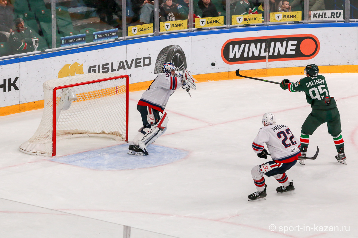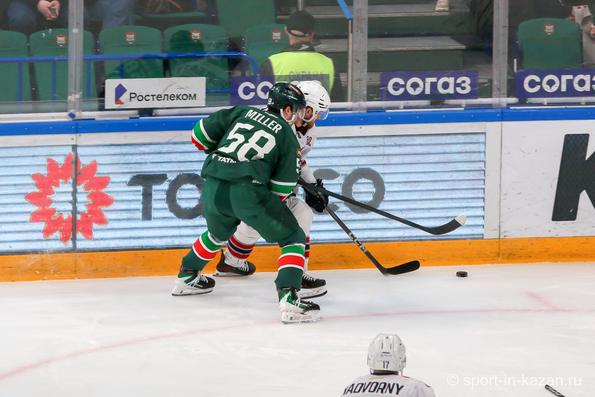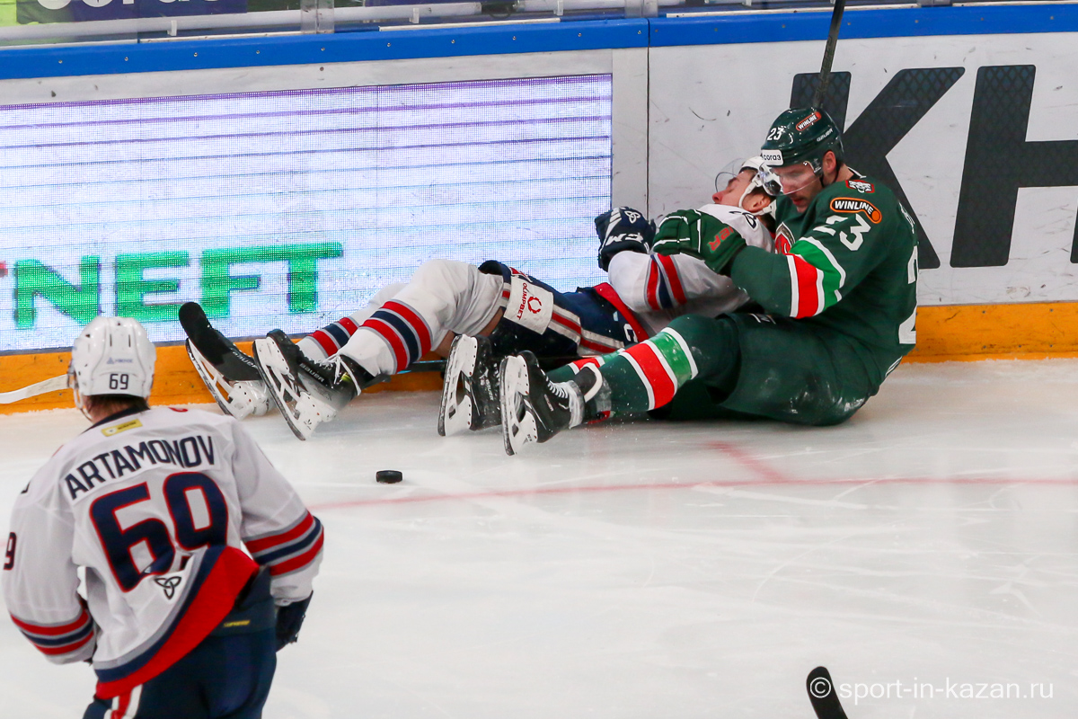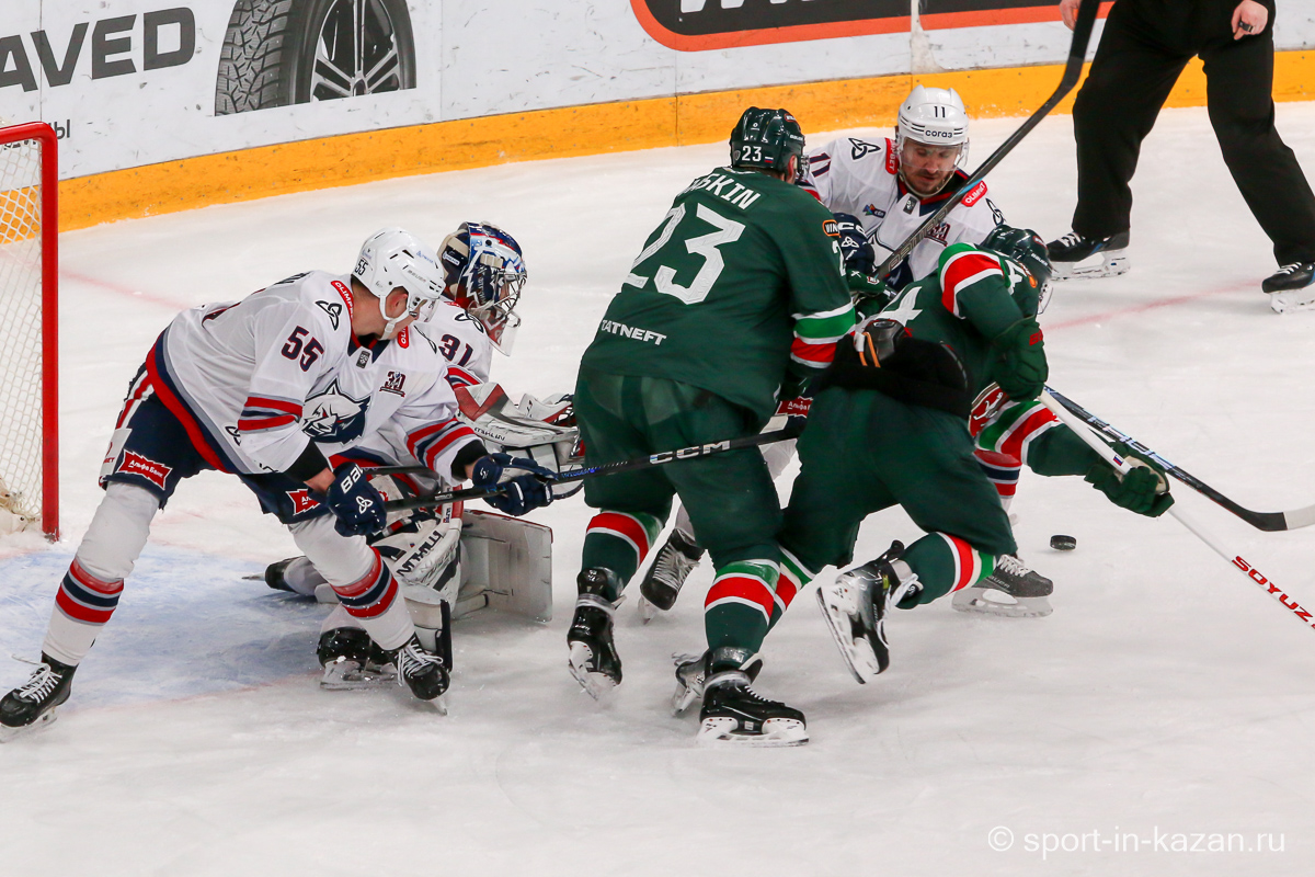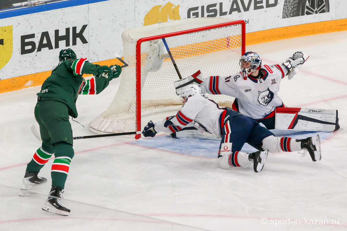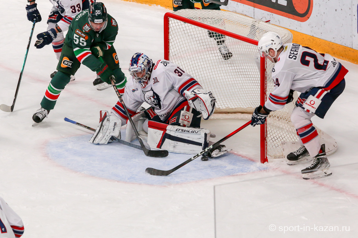 Если бы в самом начале второго периода Белозеров получил более точный пас, он бы имел чистый выход «один в ноль» с Биляловым и потенциальные 0:2. После этого Билялов чудесным образом спас свои ворота после выстрела Профаки – «Нефтехимик» продолжал переигрывать хозяев. На 25-й минуте «барсы» впервые создали момент у ворот Озолина, но голкипер с плотным броском Лучевникова справился. Ближе к середине матча хозяева наконец перехватили инициативу и провели ряд затяжных позиционных атак, но потом немного «отпустили вожжи» и позволили подопечным Гришина несколько раз потревожить Билялова. К концу периода давление «Ак Барса» возросло и Семенов, Хмелевский, Сафонов имели реальные шансы забить, но Озолин и помогавшие ему партнеры держались и не ломались. Штурм хозяев остановили в итоге они сами, когда на 37-й минуте Биро выбил клюшку из рук соперника. Но при игре в неравных составах отличаться обязаны были хозяева, когда Сафонов и Галимов вышли на одного защитника и Артем, обожающий забивать в меньшинстве, не смог перехитрить Озолина. И после второго периода на табло горели унылые для «Ак Барса» и цифры 0:1 и ведь не скажешь, что организованно и самоотверженно действовавшие «волки» были впереди по счету не по делу.