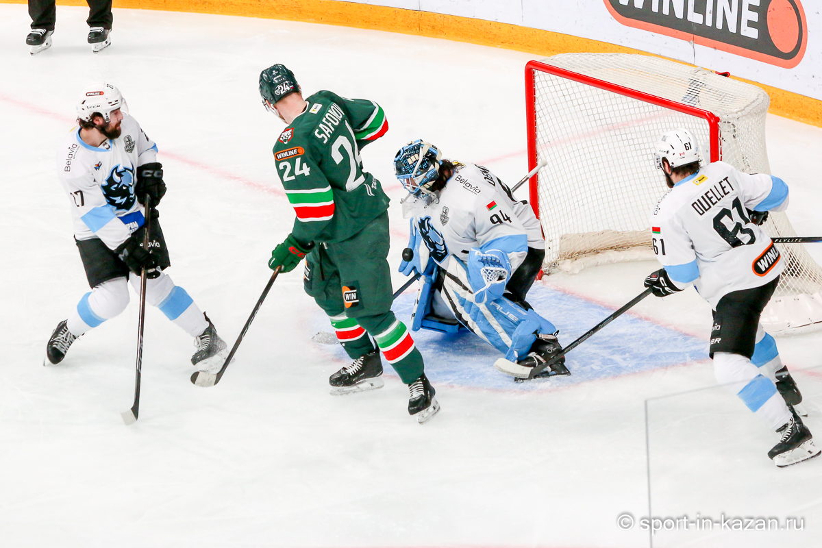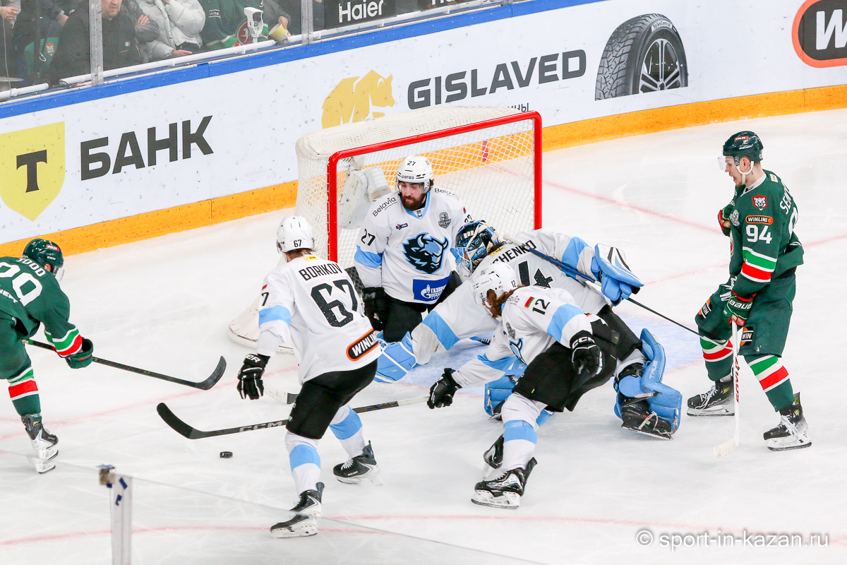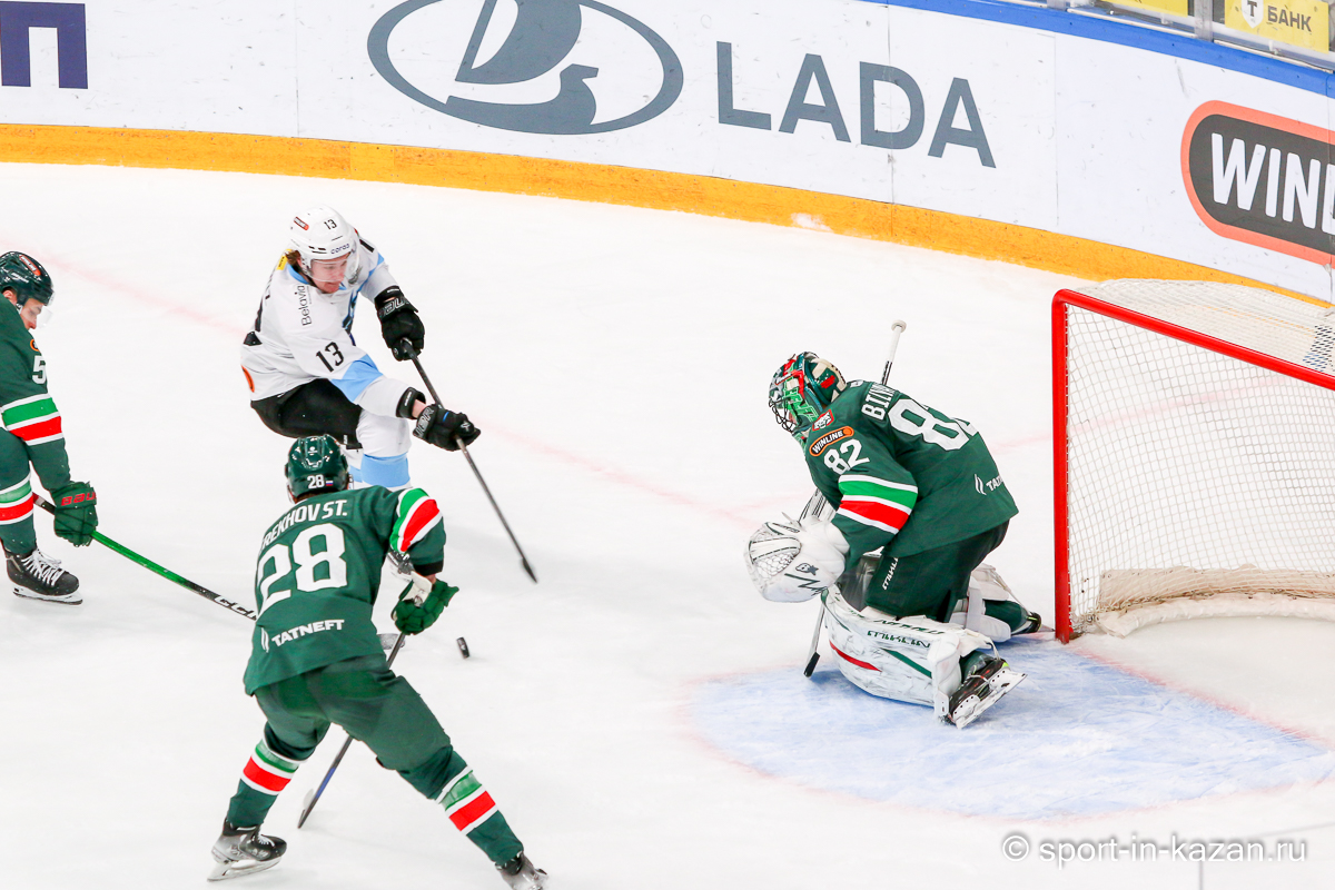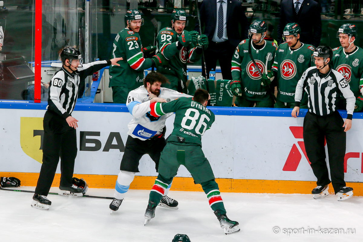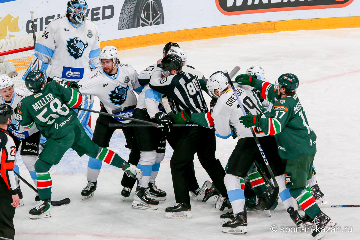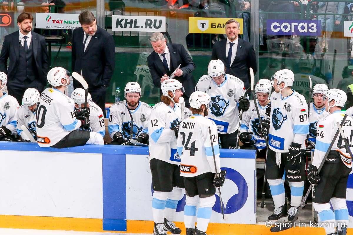 Штаб Квартальнова перетасовал звенья, поставив, в частности, Егора Борикова в  центр  первой тройки к Пинчуку и Бруку. Место в воротах занял Василий Демченко, у «Ак Барса» первым номером вышел Билялов. Как и предполагалось свою «характерность» белорусские «комсомольцы» начали проявлять с самых первых минут встречи. Сначала Мелош вызвал на бой Фисенко, затем очень жестко атаковали Кателевского. Похоже «зубры» вышли на лед не сколько умирать, сколько убивать. Покорившая в сезоне сердца многих болельщиков по всей России Золушка превратилась в тыкву – банду вылезших из пущи хулиганов.