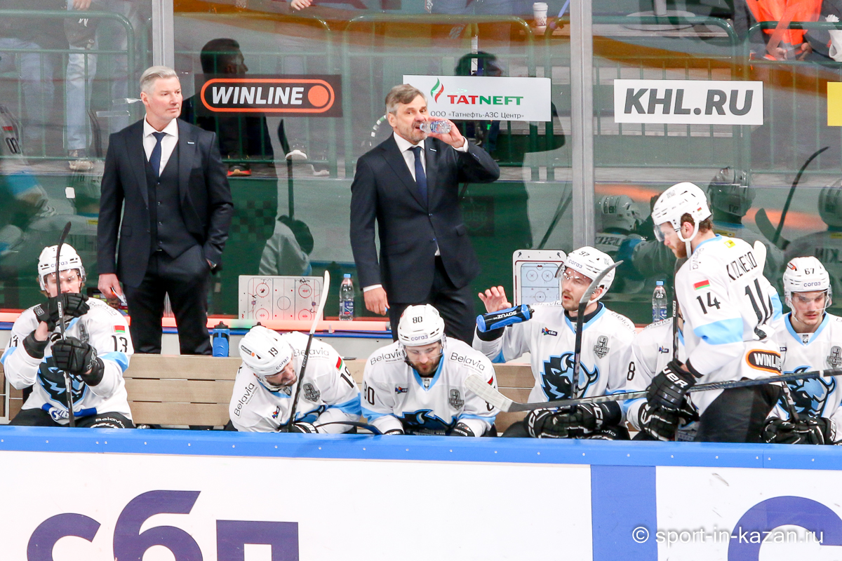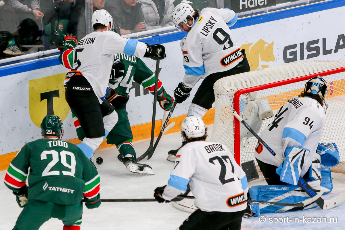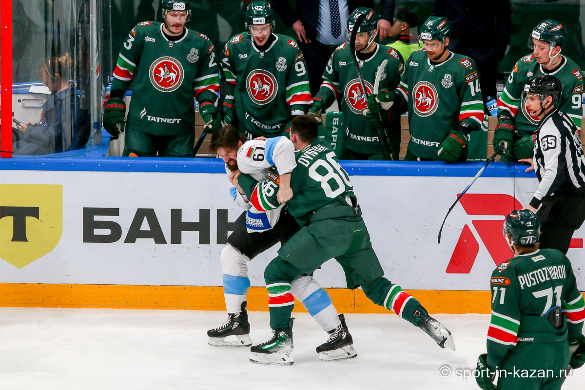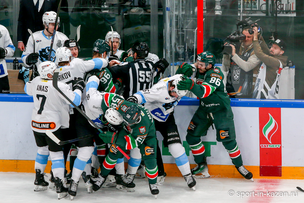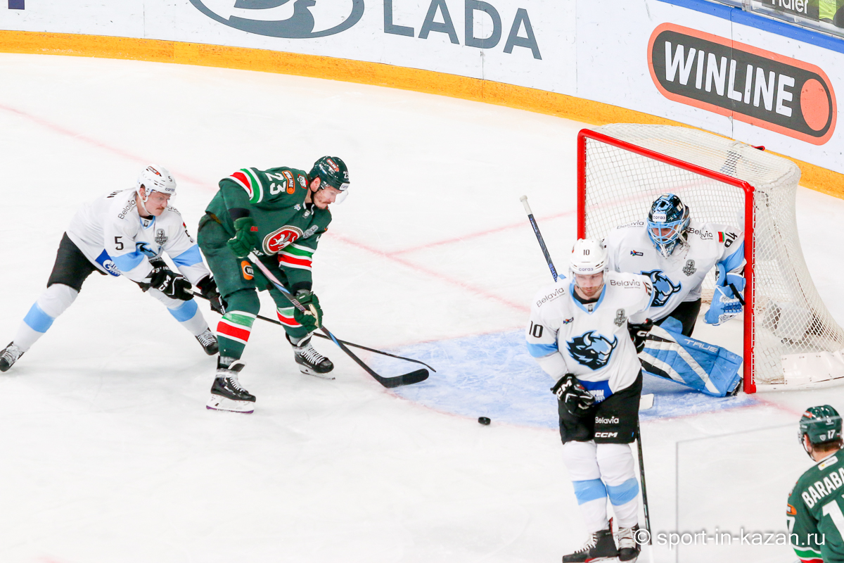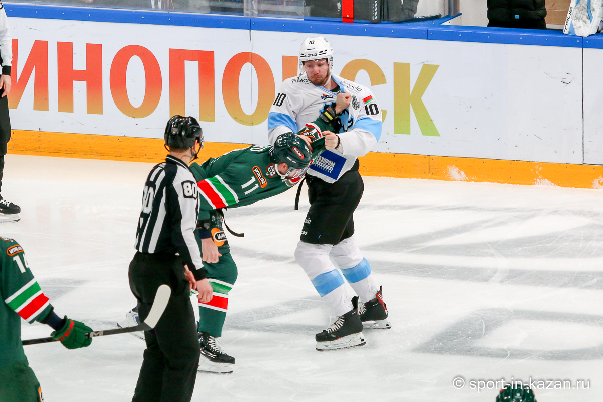 Штаб Квартальнова перетасовал звенья, поставив, в частности, Егора Борикова в  центр  первой тройки к Пинчуку и Бруку. Место в воротах занял Василий Демченко, у «Ак Барса» первым номером вышел Билялов. Как и предполагалось свою «характерность» белорусские «комсомольцы» начали проявлять с самых первых минут встречи. Сначала Мелош вызвал на бой Фисенко, затем очень жестко атаковали Кателевского. Похоже «зубры» вышли на лед не сколько умирать, сколько убивать. Покорившая в сезоне сердца многих болельщиков по всей России Золушка превратилась в тыкву – банду вылезших из пущи хулиганов.