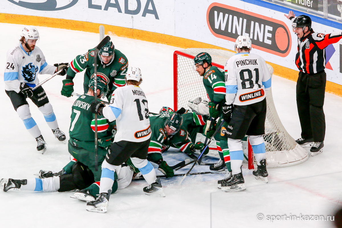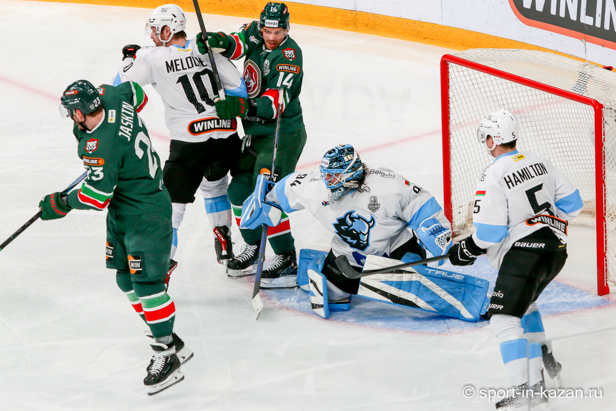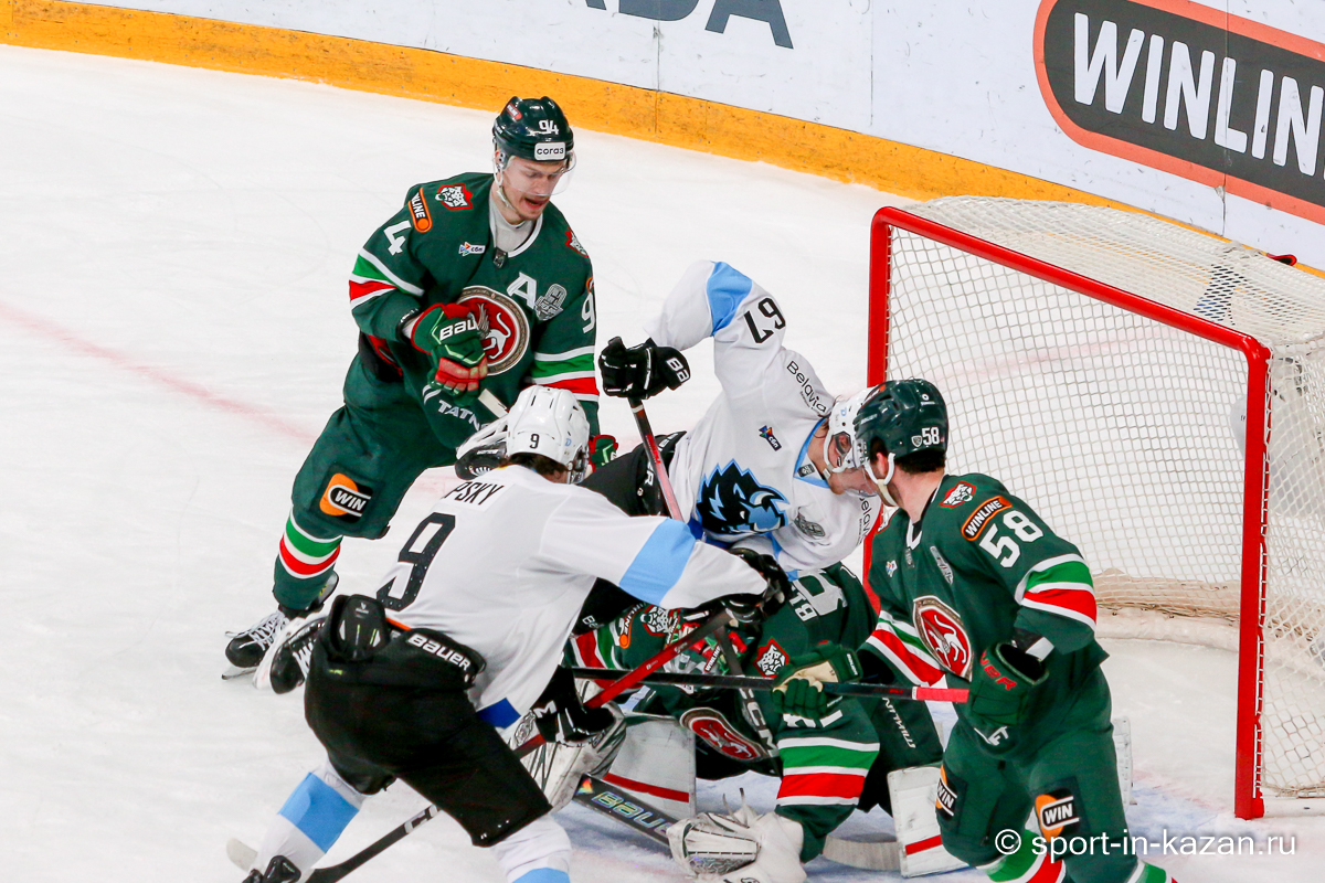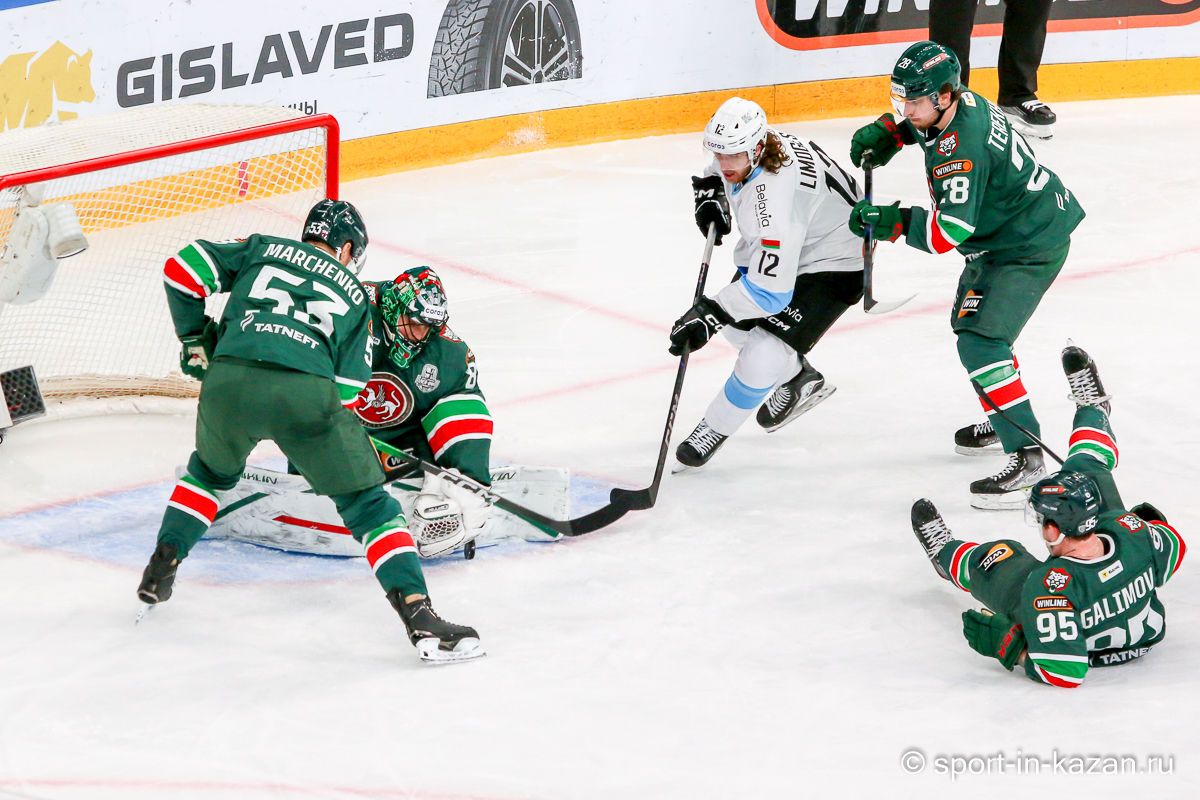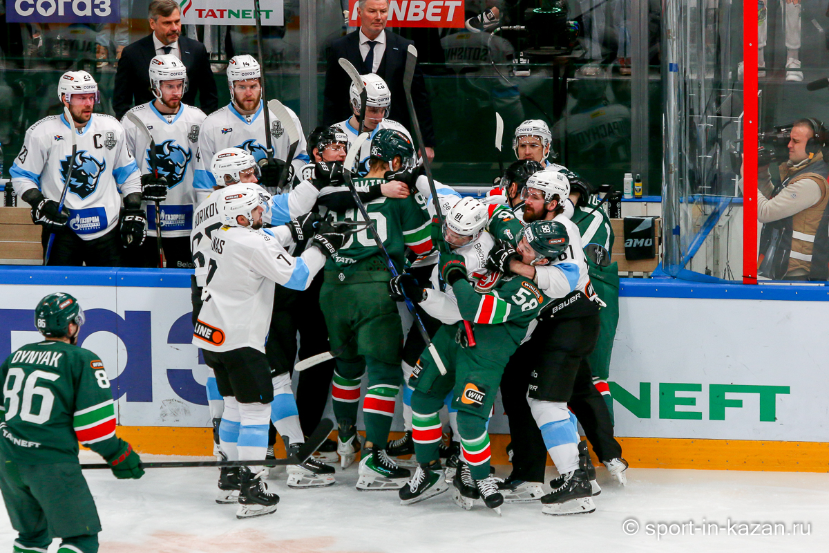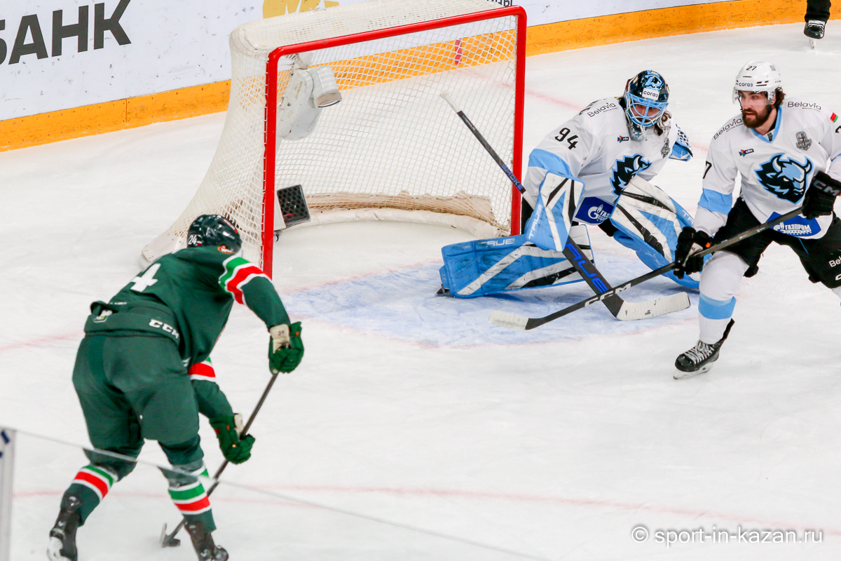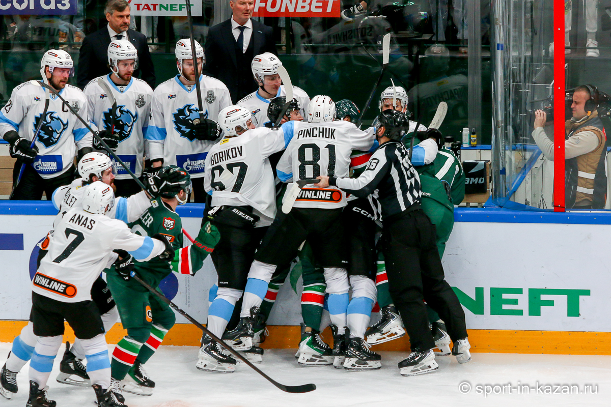 Штаб Квартальнова перетасовал звенья, поставив, в частности, Егора Борикова в  центр  первой тройки к Пинчуку и Бруку. Место в воротах занял Василий Демченко, у «Ак Барса» первым номером вышел Билялов. Как и предполагалось свою «характерность» белорусские «комсомольцы» начали проявлять с самых первых минут встречи. Сначала Мелош вызвал на бой Фисенко, затем очень жестко атаковали Кателевского. Похоже «зубры» вышли на лед не сколько умирать, сколько убивать. Покорившая в сезоне сердца многих болельщиков по всей России Золушка превратилась в тыкву – банду вылезших из пущи хулиганов.